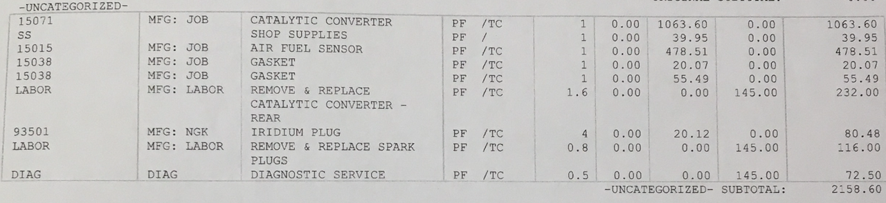 I just got back from my local car repair shop and was told that the catalytic converter needed to be replaced. Total estimate a little over $2300 after tax. Being unemployed, $2300 might as well be $2.3 million.