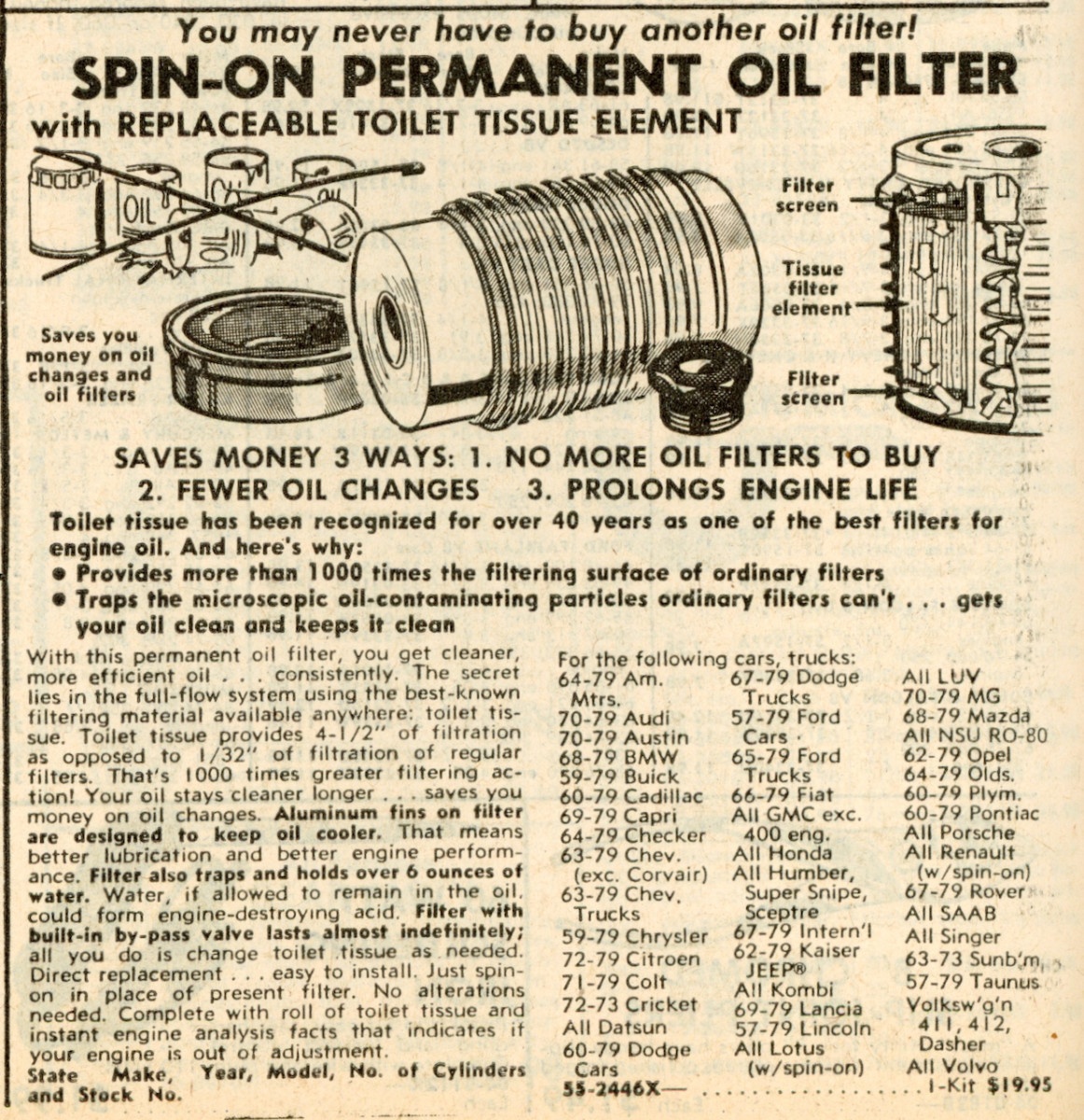 I could buy 100 spin on filters for the price of this gizmo. That's about 500,000 miles worth. And my oil won't be full of cellulose fibre.